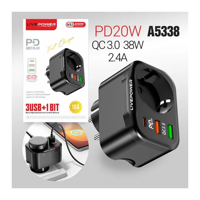 Многофункциональный сетевой фильтр Live-Power NS3 3USB+1 розетка (QC3.0+PD20W) 38W black