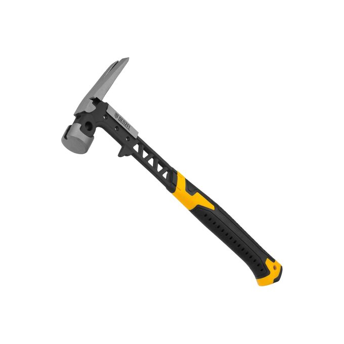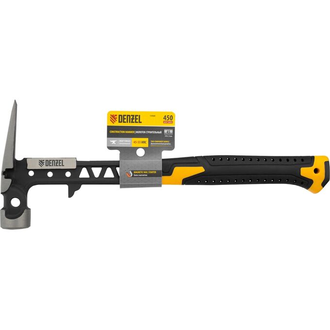 Цельнокованый строительный молоток-гвоздодер с бойком весом 450 г, с магнитом и двухкомпонентной обрезиненной рукояткой, используется при проведении строительных и монтажных работ.