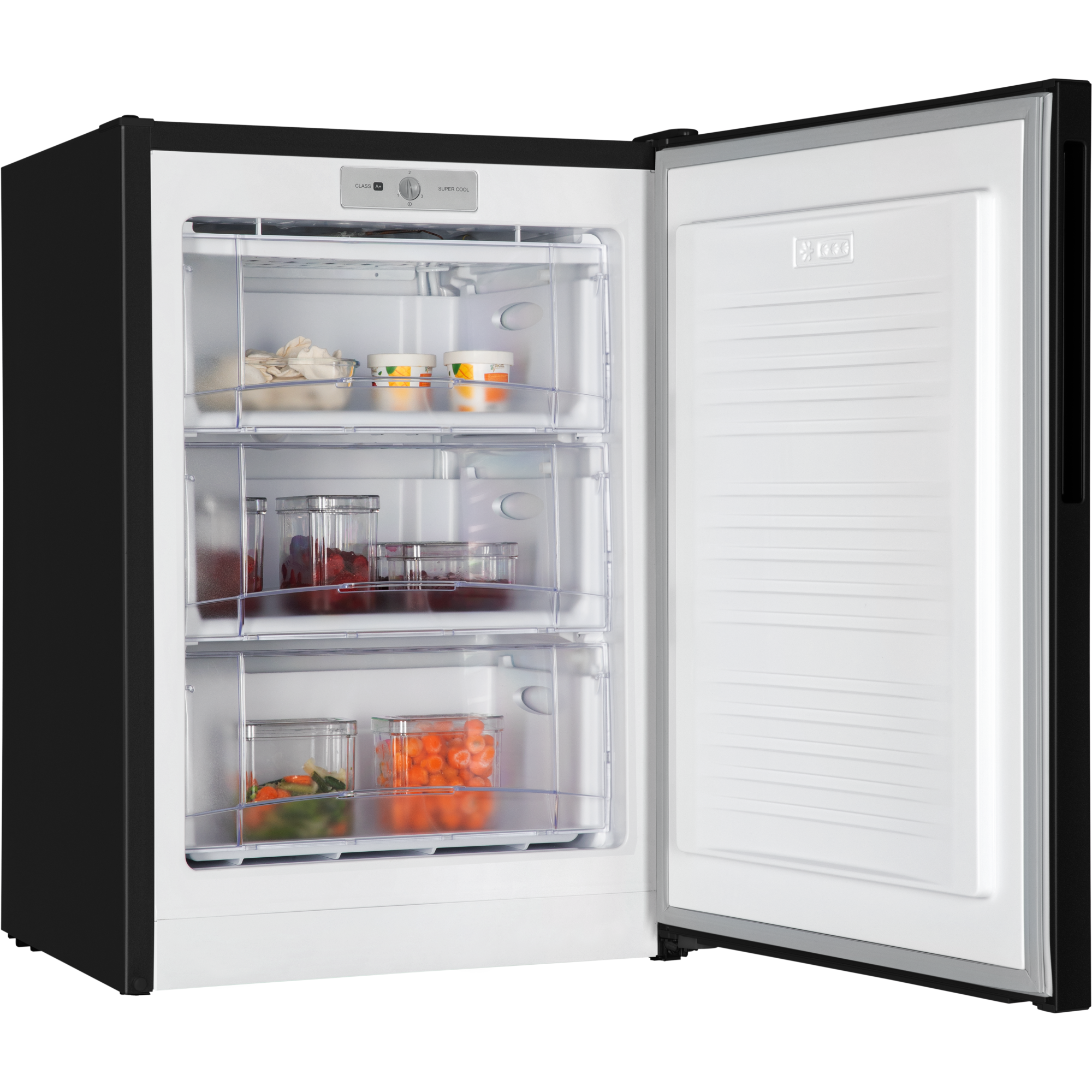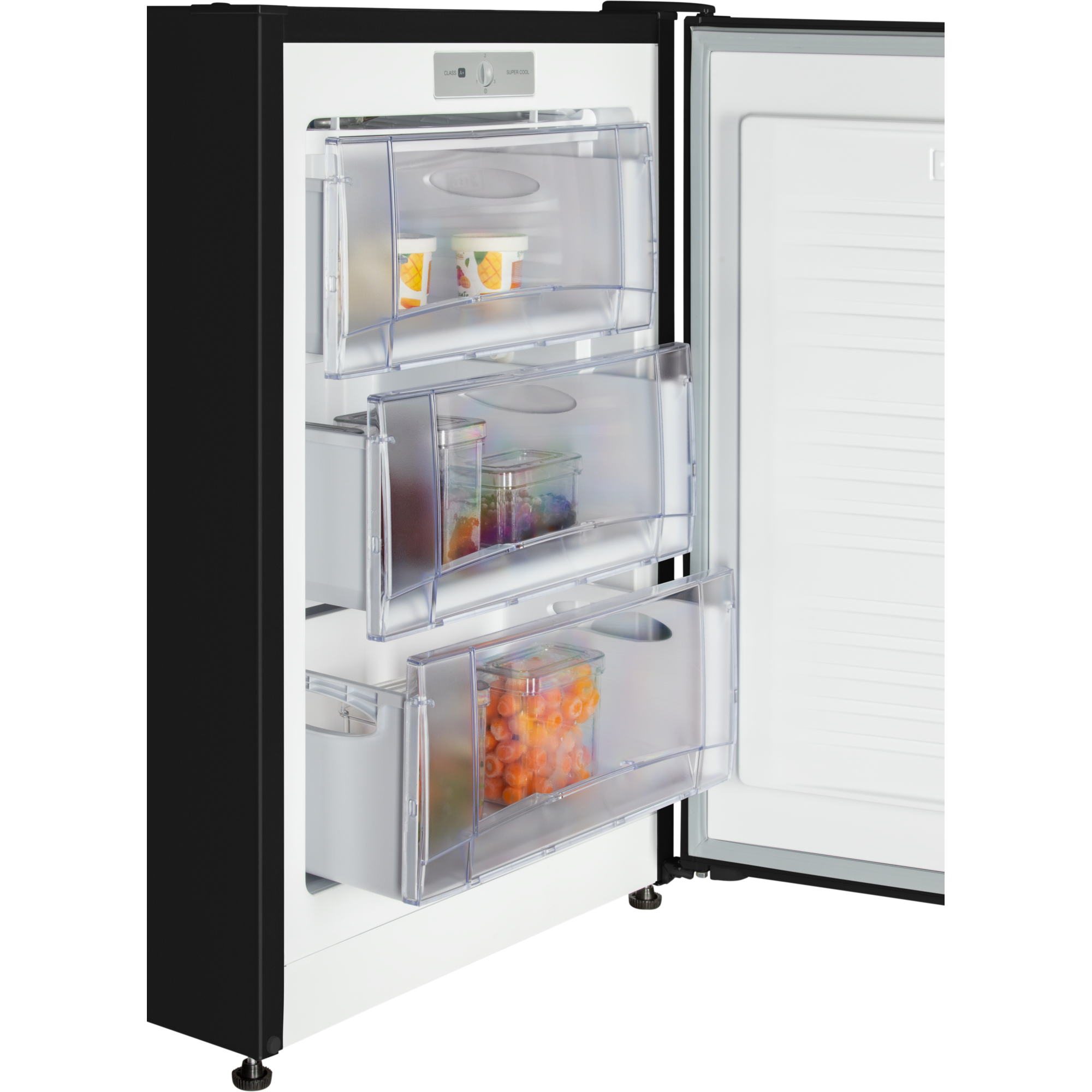 Морозильник черного матового цвета с черной интегрированной ручкой и продуманным внутренним пространством станет стильным и технологичным акцентом на вашей кухне. Высота устройства 85,4 см. Компактные размеры позволяют легко установить морозильник в малогабаритных квартирах или на даче. Для комфортного открытия и установки морозильника в удобном месте — дверь можно перенавесить с правой стороны на левую.