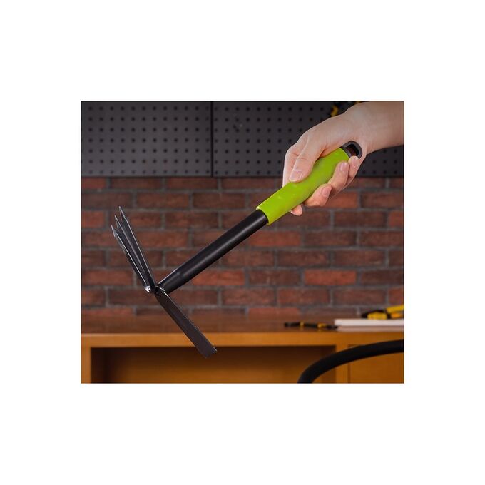 С одной стороны мотыги расположена тяпка, предназначенная для рыхления земли, прополки и прореживания кустарников. А с другой стороны - трехзубые грабли, которые идеально подходят для разрыхления почвы, сбора скошенной травы или листьев, а также для подготовки грядок перед посадкой семян или рассады.