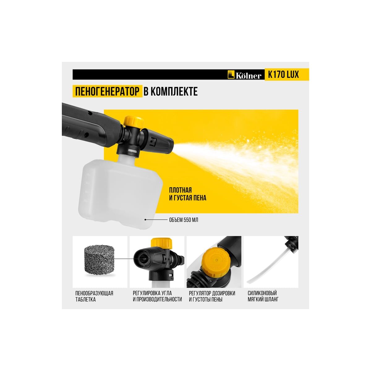 - Пеногенератор: Ускоряет процесс очистки и эффективно справляется с сильными загрязнениями, используя моющие средства