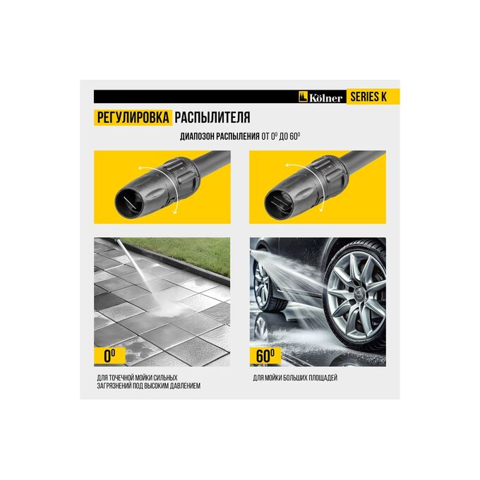 - Регулировка распылителя: Позволяет адаптировать форму струи от мощной до веерной с углом до 60°, обеспечивая гибкость в выполнении различных задач по очистке