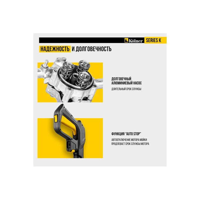 - Система AUTO STOP: Автоматическая остановка мотора при отпускании спускового крючка экономит воду и продлевает срок службы насоса