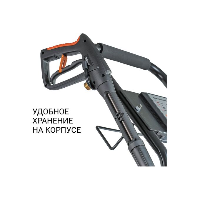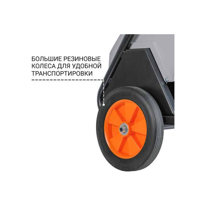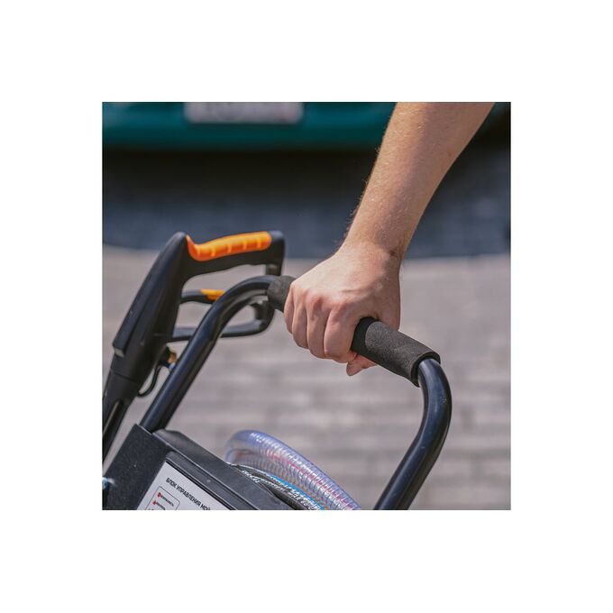 Удобство использования: мойка имеет усиленную раму на больших колесах и эргономичный дизайн с возможностью фиксации аксессуаров, что делает её удобной в использовании.