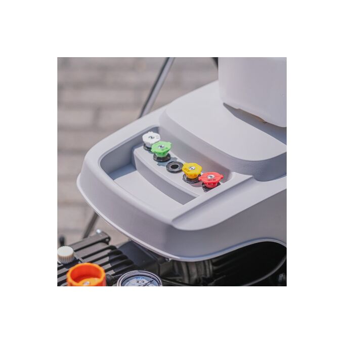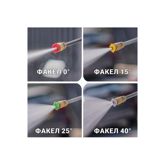 Дополнительные аксессуары: в комплекте с мойкой поставляются различные насадки и аксессуары, которые позволяют расширить её функциональность и возможности. 4 вида форсунок с разным углом распыления воды для работы с разным типом покрытия и разным видом работ. Пеногенератор с различными настройками для максимального эффекта густой снежной пены.