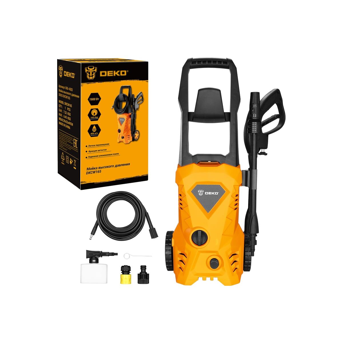 Мойка высокого давления DEKO DKCW165 предназначена для мытья транспортных средства (машин, лодок, мотоциклов и т.д.), очистки загрязненных поверхностей при помощи чистой воды под высоким давлением (при необходимости с добавлением моющих средств) в бытовых условиях.