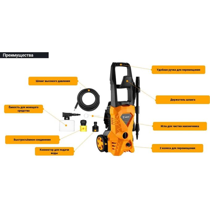 Компактный размер и наличие колес делают данную модель удобной для транспортировки и хранения. Мойка оснащена функцией Автостоп.