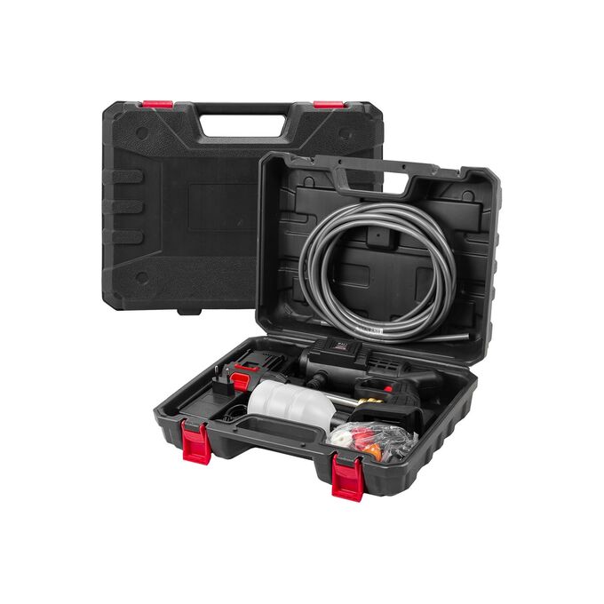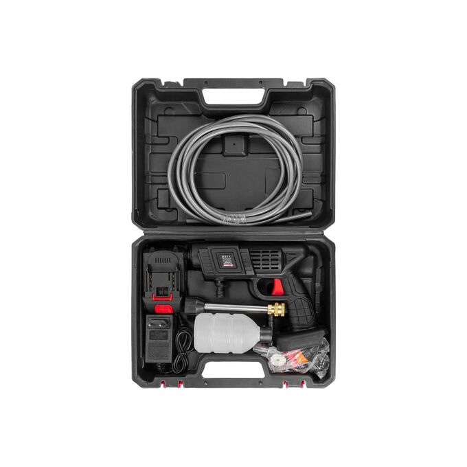 Корпус мойки высокого давления выполнен из прочного пластикового материала, который обеспечивает стойкость к механическим воздействиям и защиту от возможного удара. Весь набор поставляется в надежном пластиковом кейсе где у каждого инструмента и аксессуара есть свое место.