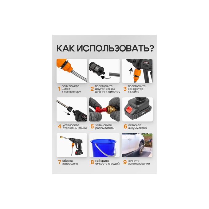 Идеально подойдет для мойки автомобиля, мотоцикла или велосипеда. Кроме того, пистолет аккумуляторный можно использовать не только для мытья, но и для полива садовых растений. Для этого следует установить на копьё рассеивающую насадку, которая обеспечит распыление воды широким факелом как из душа, и отрегулировать напор.