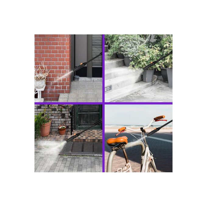 Прибор можно подключать к источнику водоснабжения с напорным давлением (например, к садовому водопроводу) или без напорного давления (дождевым бочкам, ведрам и т.д.), так как мойка оборудована самовсасывающим насосом. Для подключения устройства к источнику водоснабжения рекомендуется использовать армированный шланг с внутренним диаметром около 15 мм и длиной от 2 до 5 метров (в комплект не входит).
