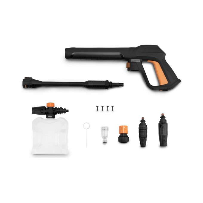 К соединительной насадке вы также можете присоединить пенную насадку с бутылкой, что позволяет быстро нанести моющее средство на очищаемую поверхность. Кроме того, в комплекте идет роторная насадка, которая обеспечивает повышенный напор воды и удаляет наиболее стойкие загрязнения.