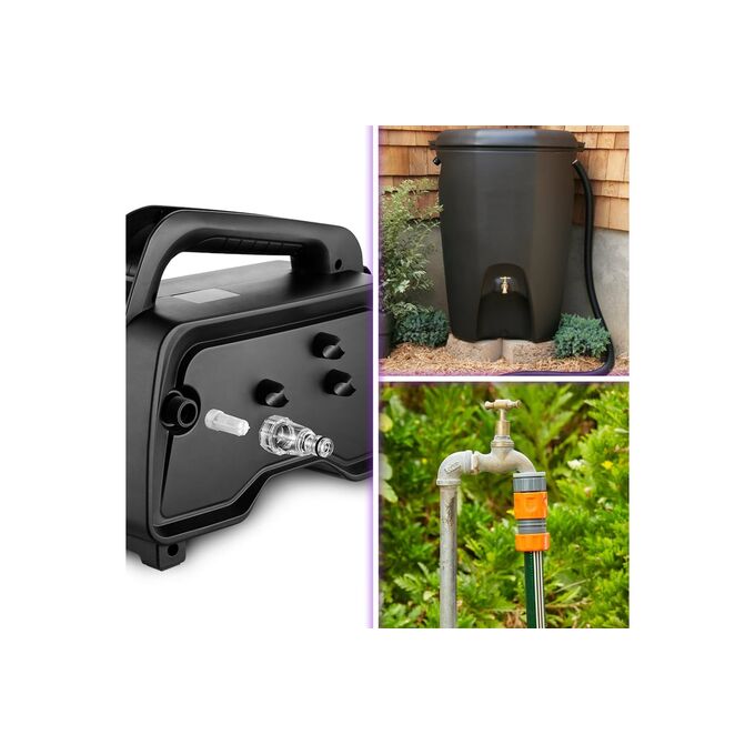 Прибор можно подключать к источнику водоснабжения с напорным давлением (например, к садовому водопроводу) или без напорного давления (дождевым бочкам, ведрам и т.д.), так как мойка оборудована самовсасывающим насосом. Для подключения устройства к источнику водоснабжения рекомендуется использовать армированный шланг с внутренним диаметром около 15 мм и длиной от 2 до 5 метров (в комплект не входит).