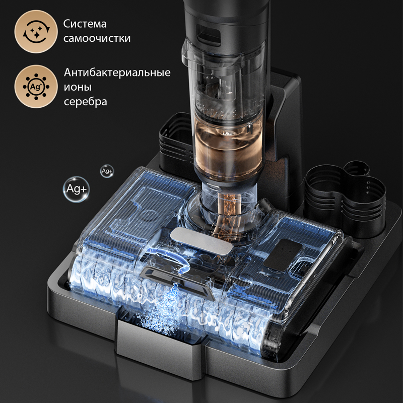 Преимущества Мощность всасывания 100 аВт, Самоочистка и сушка горячим воздухом, Съемный аккумулятор, Двигатель IPX8 мощностью 400 Вт, Комплектация 3 в 1, Портативная конфигурация для уборки мебели