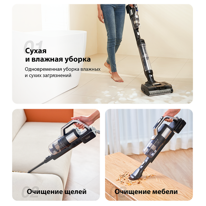 Одно нажатие кнопки позволяет переключиться с вертикального моющего пылесоса на портативный пылесос с ручным управлением. Благодаря множеству аксессуаров в комплекте можно легко очищать пол, кровать, диван и многое другое.