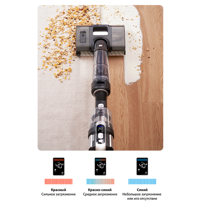 На LED-дисплее вы можете отслеживать уровень заряда, следить за индикатором чистоты пола и управлять режимами работы пылесоса. Дисплей оснащен функцией голосовых оповещений, позволяющих вам оптимизировать уборку. Голосовые оповещения доступны на 5 языках, включая русский.