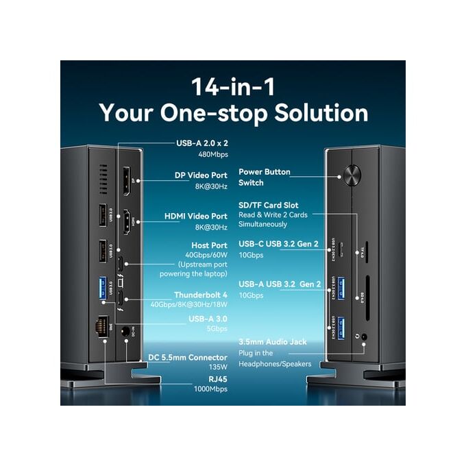 Поддержка: HDMI v2.1/DP1.4 (8K@30Гц)+3D; USB 3.2 Gen 2-C ; USB 2.0 ; USB 3.0 ; CTIA ; Gigabit Ethernet ; 2.0 SD 1-LUN ; Thunderbolt 4