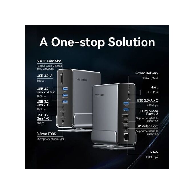 USB-C F / OTG USB 3.2 Gen 2-C F / OTG USB 3.2 Gen 2-A F x 2 / OTG USB 3.2 Gen 1-C F / OTG USB 3.0-A F / OTG USB 2.0-A F x 2 / USB PD CF / HDMI 19F x 2 / RJ45 F / TF F / SD F / mini-jack F(TRRS OMTP/CTIA) / DP F