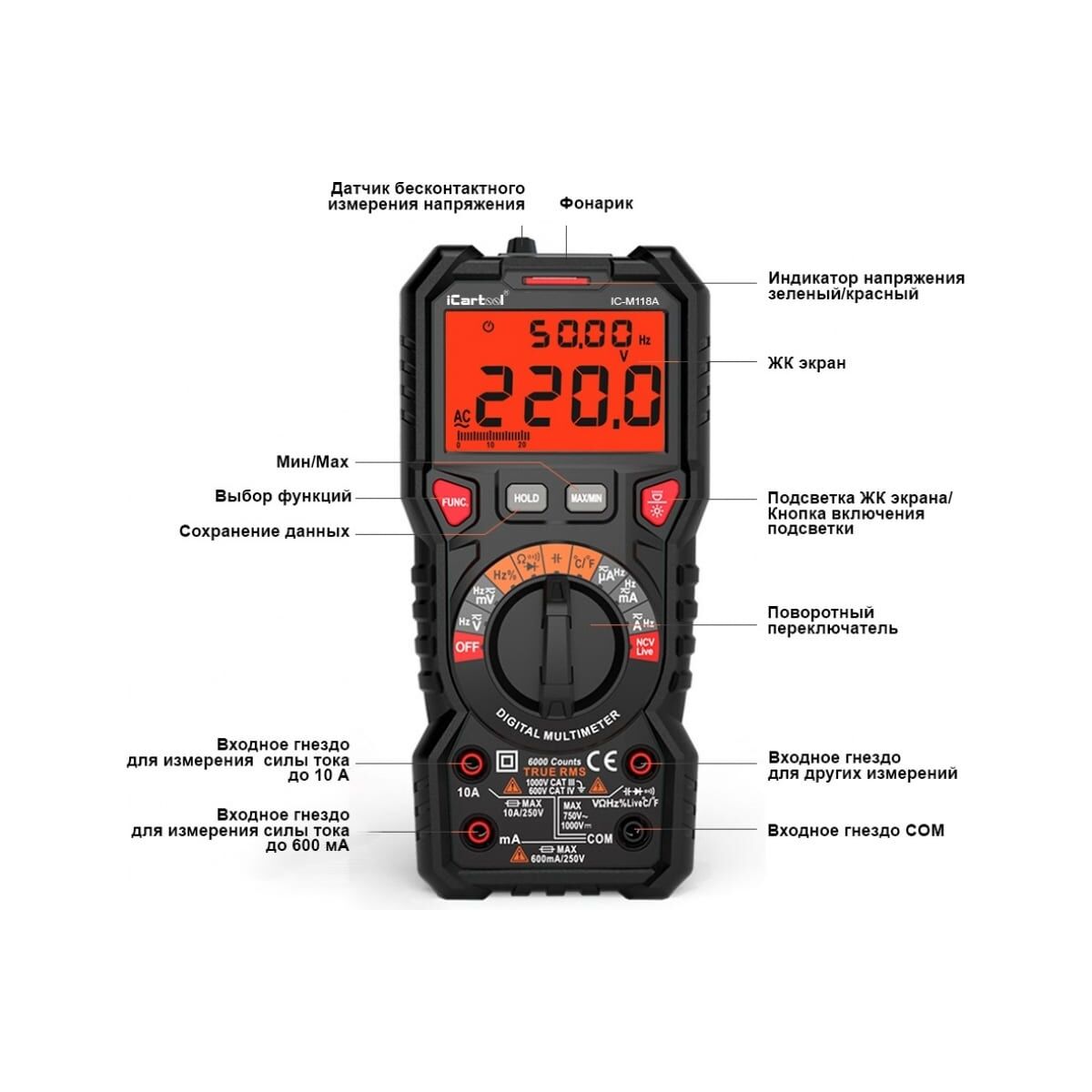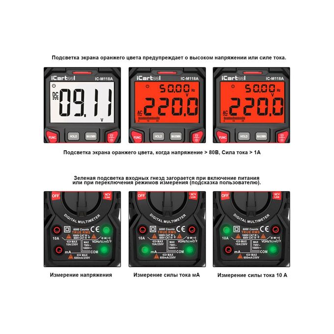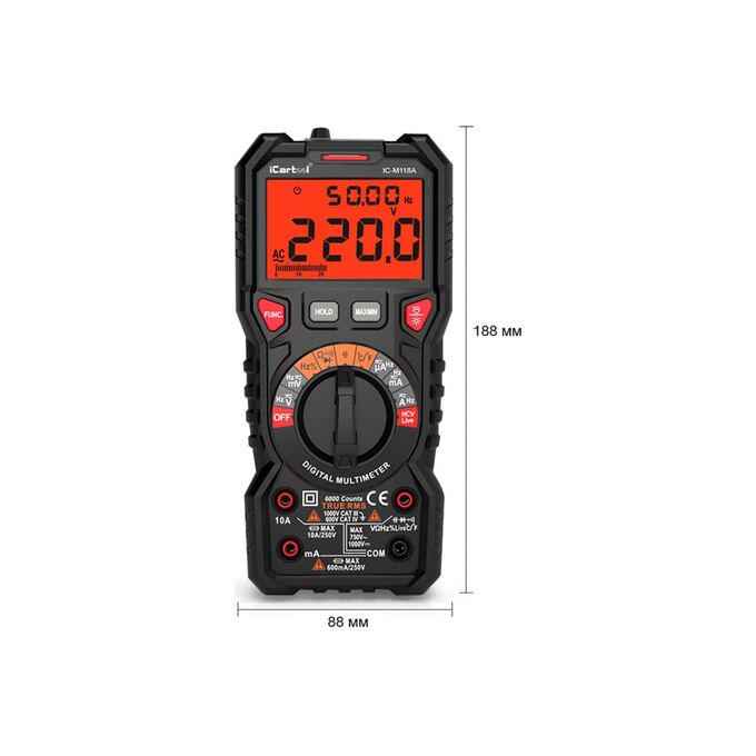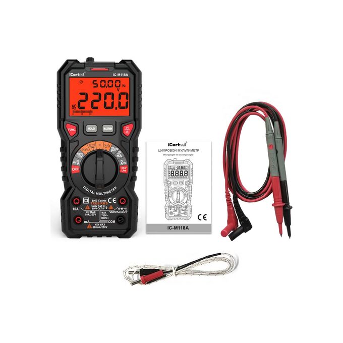 Цифровой мультиметр iCartool IC-M118A - профессиональный прибор с широким функционалом для использования в промышленности или в лабораторных целях. Имеет высокий рейтинг безопасности.