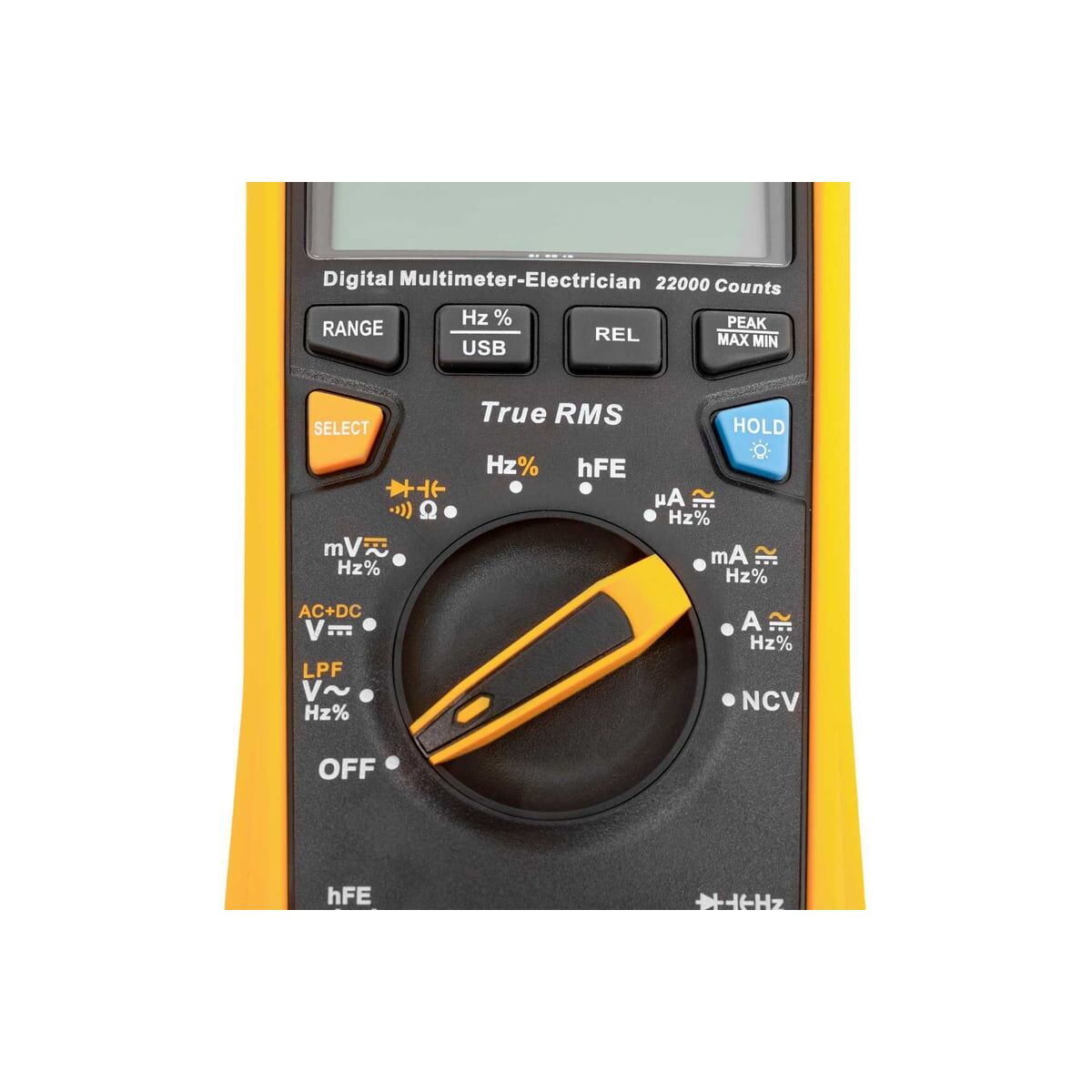 Выбор диапазона измерения производится автоматически или вручную. Прибор также оснащен функцией NCV(бесконтактный датчик напряжения) и USB подключением.