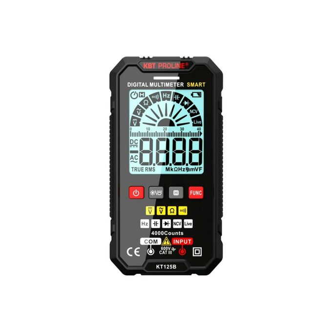Цифровой мультиметр КВТ SMART KT 125В PROLINE 86325 оснащен большим цветным ЖК-дисплеем и удобной шкалой выбора режима измерений. Имеет среднеквадратический метод измерения значений – True RMS.