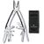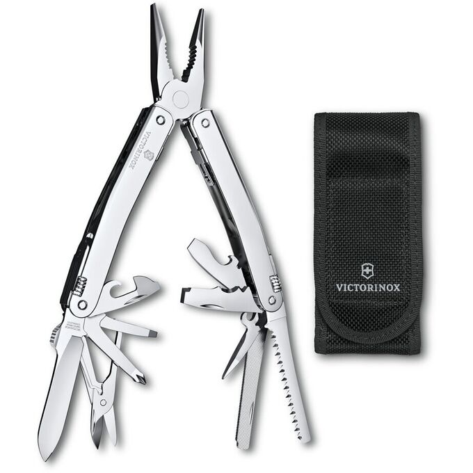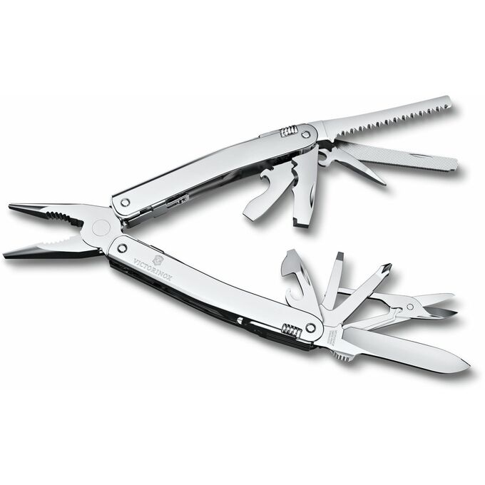 В комплекте: острогубцы с: кусачками для тонкой и мягкой проволоки твёрдостью до 40 HRC, кусачками для твёрдой проволоки большое лезвие; консервный нож с: отверткой 3 мм.; открывалка для бутылок с: отверткой 6 мм., фомкой, инструментом для сгибания проволоки, отвертка 2 мм. Шило, кернер с: многофункциональным крючком, ножницы, пила по дереву, пила по металлу с: напильником по металлу, крестовая отвёртка 1/2, стамеска 7 мм. и скребок с: кусачками для продольной резки изоляции, кусачками для поперечной резки изоляции, инструментом для снятие изоляции, гнездо штопора.
