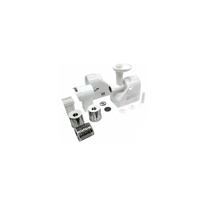 защита от перегрузки, мытье в посудомоечной машине, отсек для сетевого шнура, отсек для хранения насадок, прорезиненные ножки, Номинальная мощность 220 Вт.Время непрерывной работы 5 мин, насадки для приготовления колбас, система реверса, толкатель