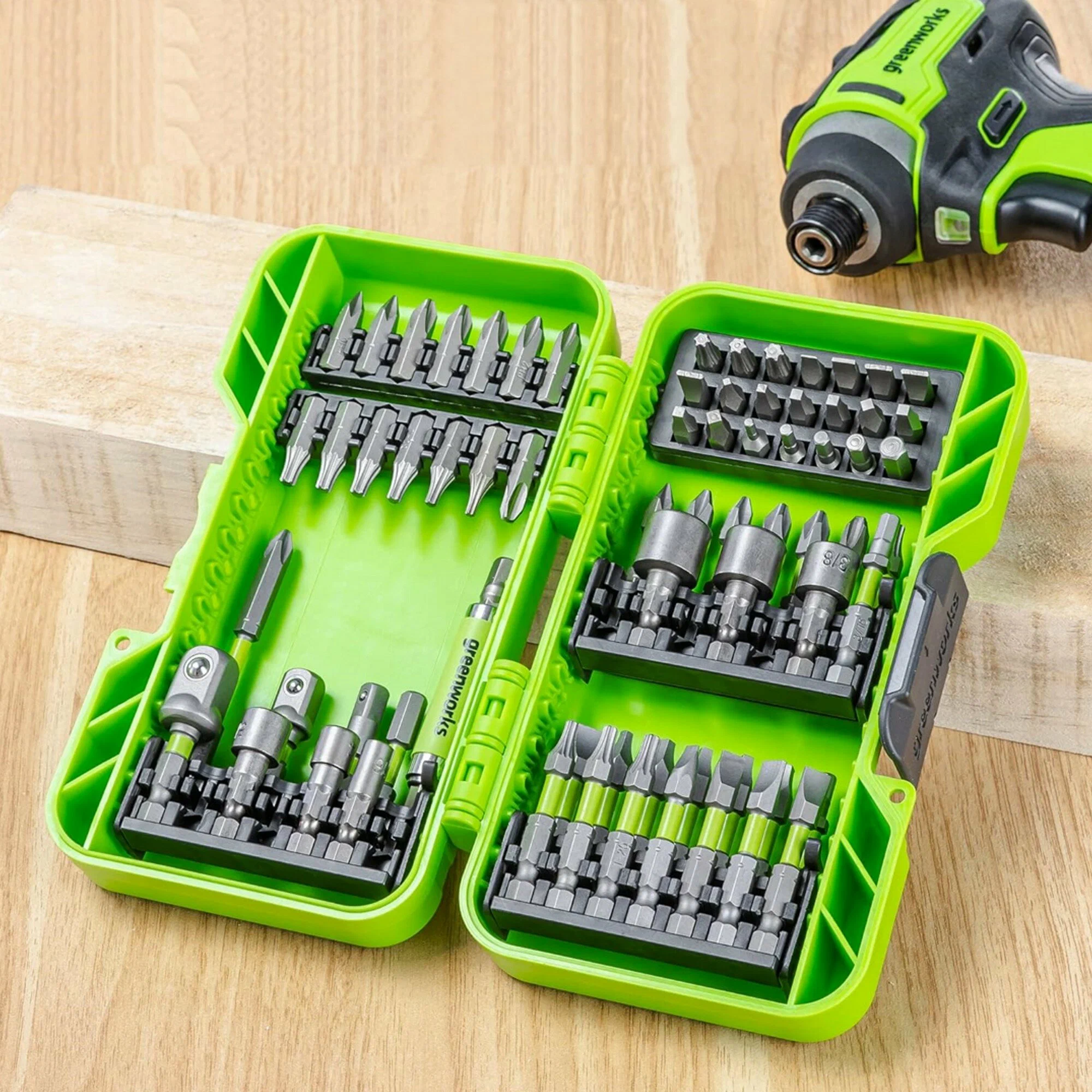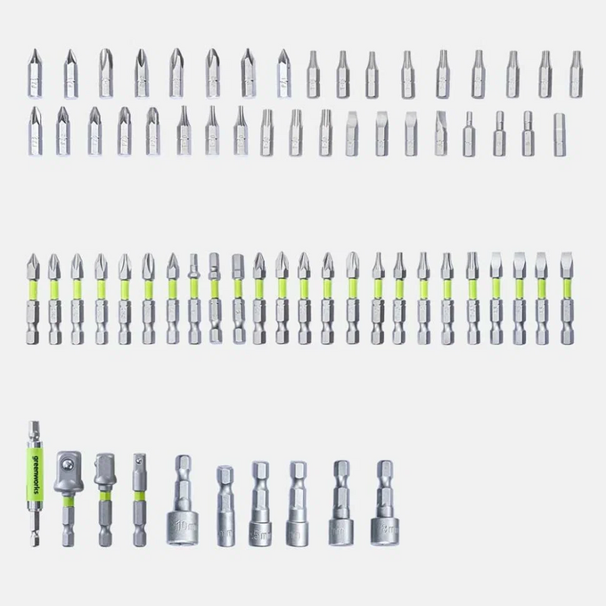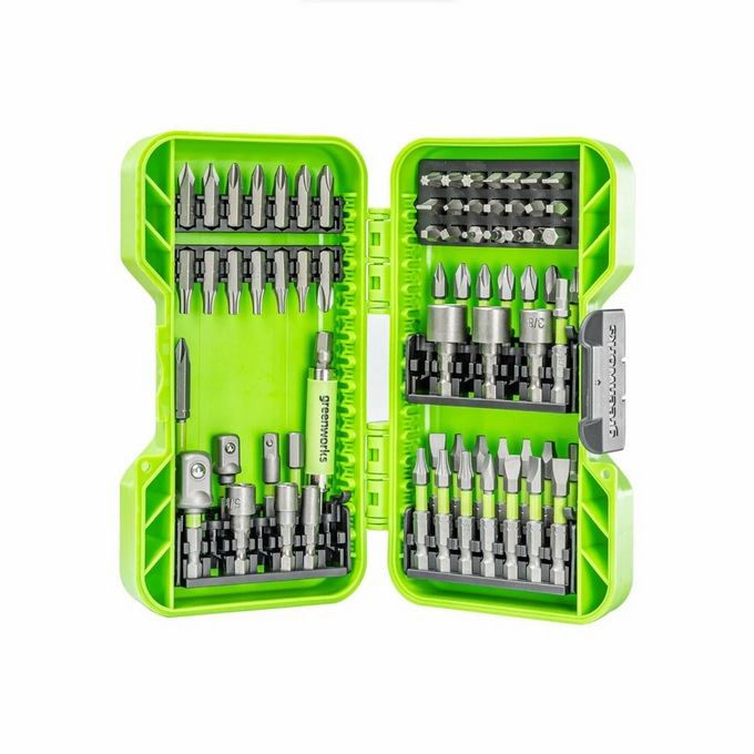 Набор бит, торцевых головок и адаптеров в кейсе Greenworks арт. 2944407, 70 шт.