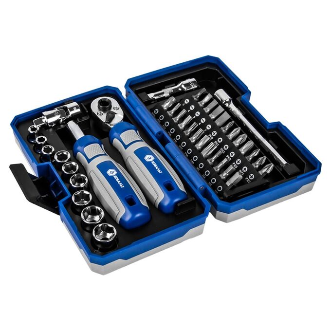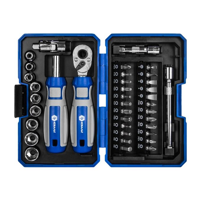 Набор бит и головок с трещоткой предназначен для работ с различным типом крепежа. Отверточная рукоятка в наборе предназначена для работы с битами, которые надёжно фиксируются в рукоятке благодаря встроенному в неё магниту. Трещоточная рукоятка в наборе позволяет работать как с головками, так и с битами без использования переходника. Все изделия в составе набора выполнены из хром-ванадиевой стали. Кейс выполнен из пластика с вставками из резины.
