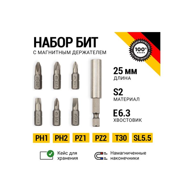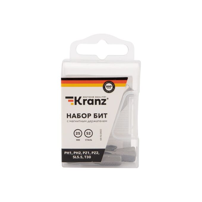 Набор бит с магнитным держателем (7 предметов; PH1, PH2, PZ1, PZ2, SL5.5, T30; сталь S2) KRANZ KR-92-0433 предназначен для закручивания различных видов крепежа.