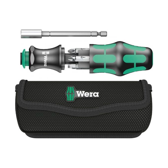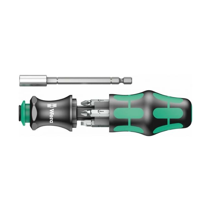 Утопленная в ручке телескопическая вставка (которую можно использовать в качестве держателя для винтоверта) и встроенный магазин для насадок;