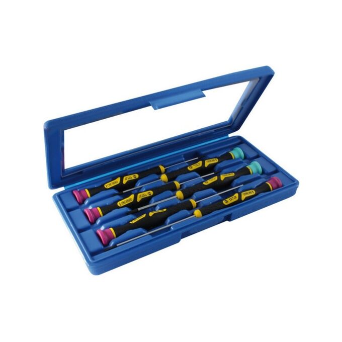 Набор часовых отверток широко распространен в области ремонта мобильных гаджетов, часовых механизмов, измерительных приборов и мн. др. Отвертки представляют собой сочетание эргономичных ручек из двухкомпонентного материала (твердое ядро и вращающаяся верхняя часть из PP, мягкая обложка из TPE) и прочных рабочих частей из высоколегированной стали с чернеными наконечниками и хромовым антикоррозийным покрытием.