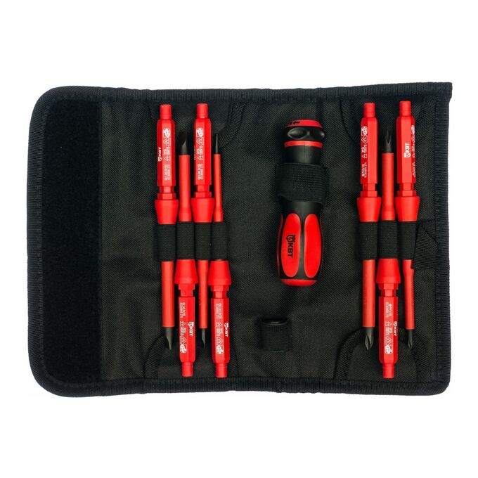 Набор диэлектрических отверток включает в себя рукоятку с надежным поворотным механизмом, сменные стержни с разными шлицами, а также сумку с петлей для ношения на поясе для удобства использования. Диэлектрическое покрытие позволяет работать с оборудованием под высоким напряжением. Намагниченный наконечник облегчает установку и развинчивание крепежа в труднодоступных местах.