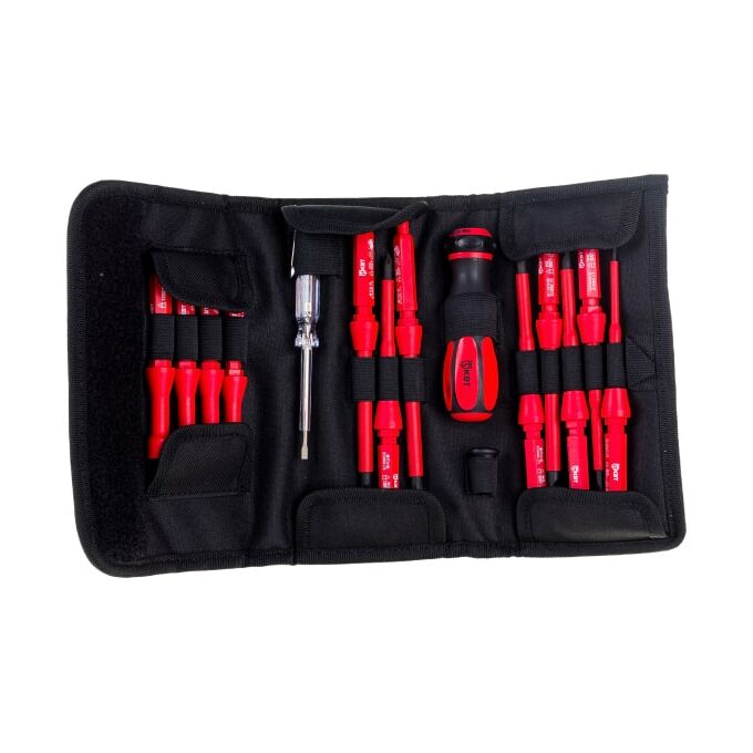 Набор диэлектрических отверток - комплект для электромонтажных работ, состоящий из эргономичной рукоятки и различных стержней с изоляцией. Комплектуется сумкой для переноски на поясе. На каждую отвертку нанесено обозначение типоразмера.