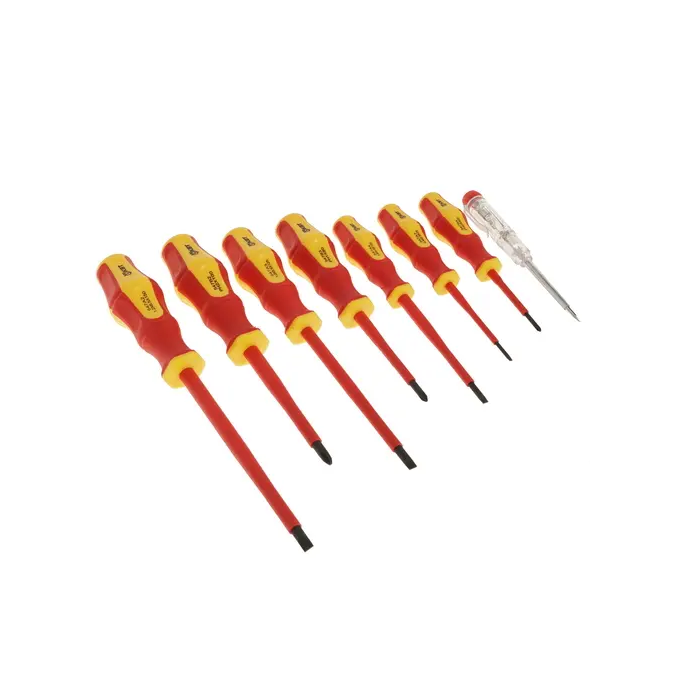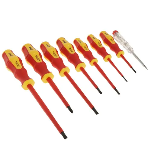 Набор отверток – удобное приспособление для работы под напряжением 1000 В. Модель состоит из 8 предметов, которые поставляются в удобной сумке с замком. Изделие подходит для профессионального или бытового использования. Хромованадиевая сталь обеспечивает высокую прочность и долговечность инструмента.