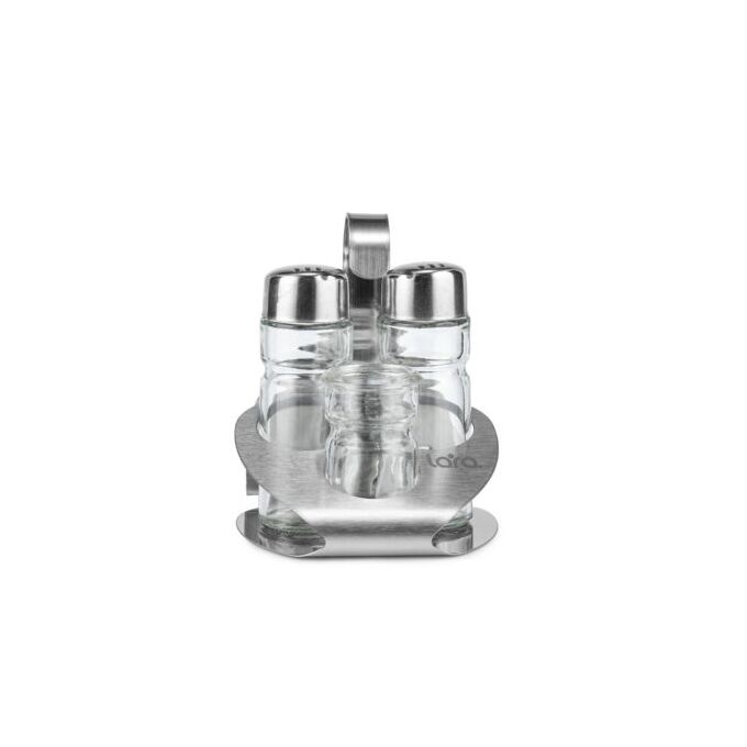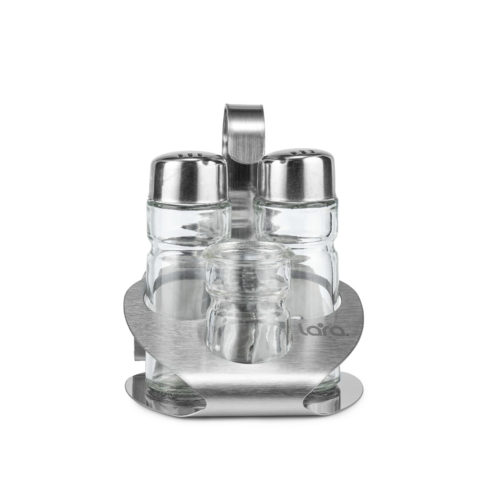 Набор для специй LARA – это практичный и многофункциональный аксессуар для сервировки стола. В комплект входит устойчивая подставка из экологичной высококачественной нержавеющей стали с сатинированной отделкой. Конструкция с удобным кронштейном для переноски, вместительным отсеком для салфеток и отделениями для хранения солонки, перечницы и емкости для зубочисток. Каждая из них выполнена из толстого прозрачного стекла. Съемные крышки с отверстиями изготовлены из нержавейки с зеркальной полировкой. Возможно мытье в посудомоечной машине.