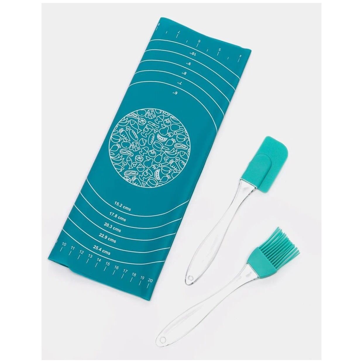3 предмета: - кисточка (18*3 см), 13 гр- лопатка (17*3 см), 15 гр- коврик для раскатки теста однотонный, с разметкой (30*33 см, толщина 0,6 мм), 85 гр. Лопатка гибкая предназначена для равномерного распределения крема, масла, соуса или начинки. Кисточка предназначена для смазывания поверхностей посуды, а также продуктов перед запеканием или жаркой. Температура использования от -60°С до +260°С