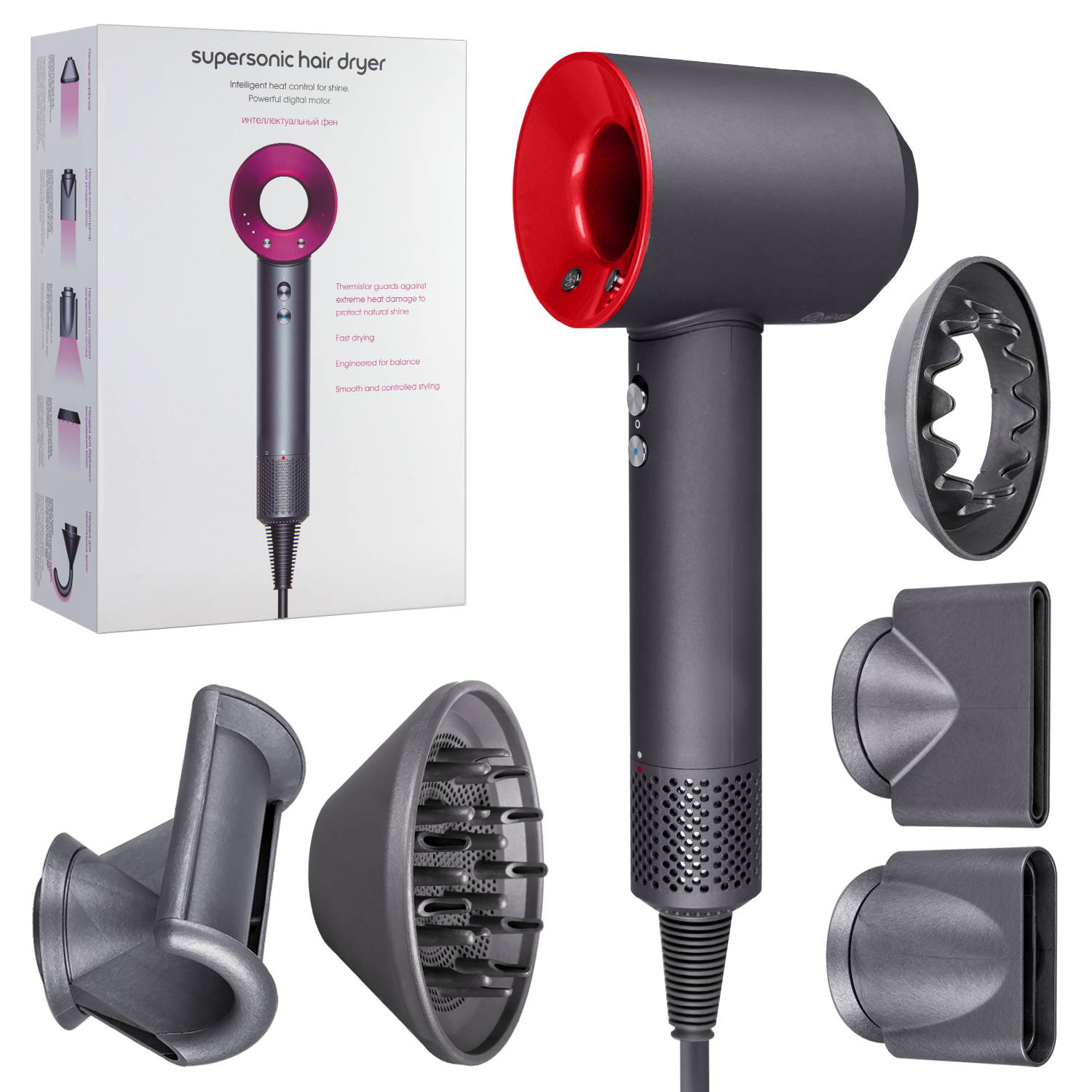 Набор фен supersonic (6 в 1) 1.8м (Серый с красным)