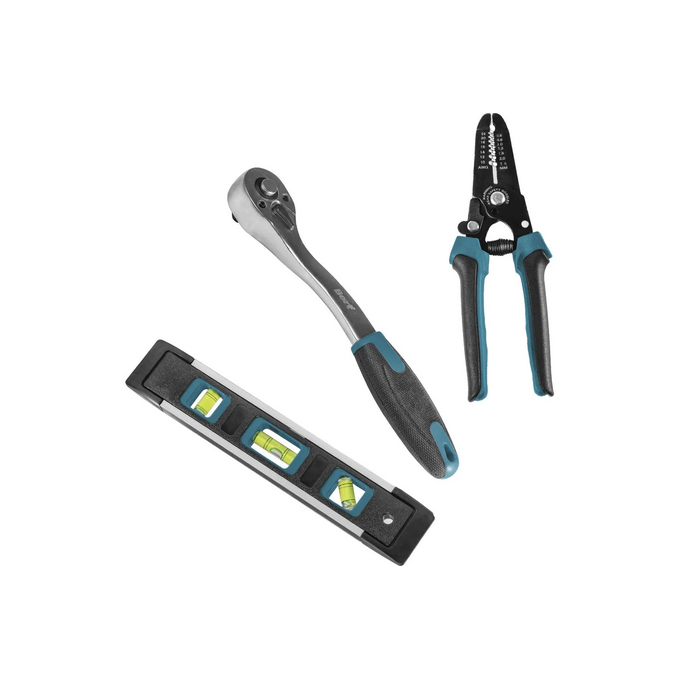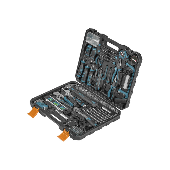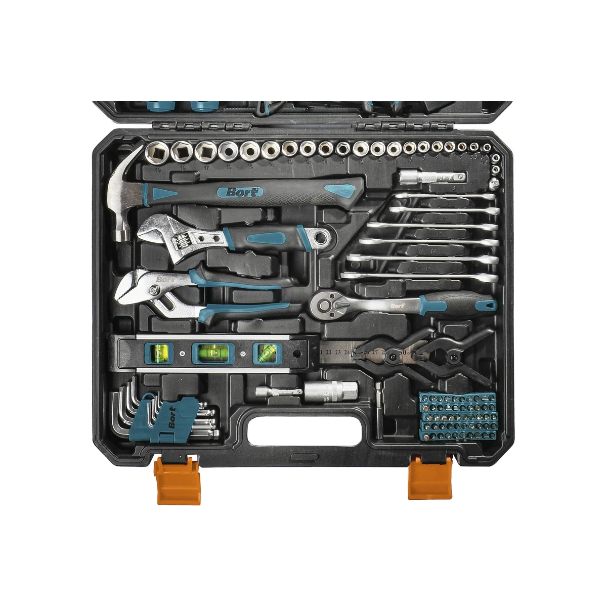 Набор ручного инструмента Bort BTK-210 - это незаменимый помощник для слесарных и ремонтных работ. В комплект входит 210 предметов, которые аккуратно упакованы в прочный кейс. Набор включает в себя 50 бит, 22 торцевые головки, 6 гаечных ключей, 9 имбусовых ключей, 8 отверток, а также множество других полезных аксессуаров, таких как изолента, нож, ножницы, бита-адаптер для торцевых головок, держатель для бит, лезвия для ножа, рулетка, линейка, набор крепежа, уровень и удлинители для бит и головок.