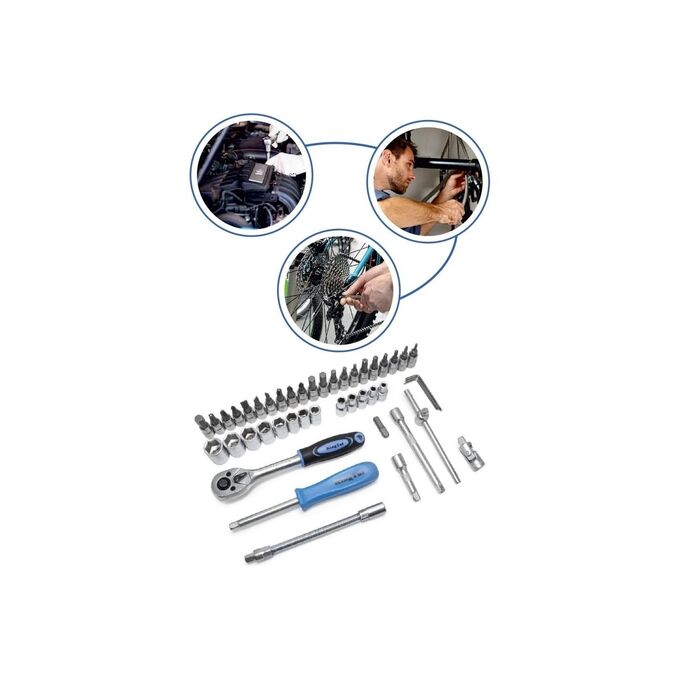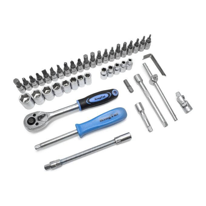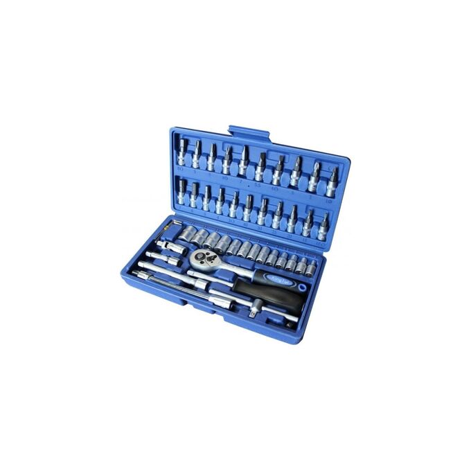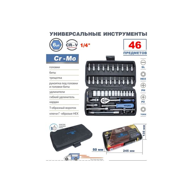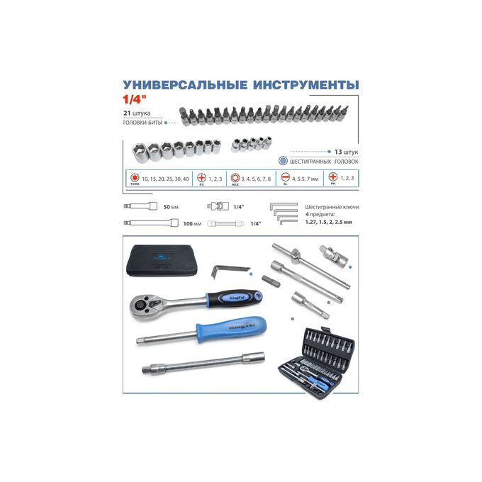 Набор инструментов отличается оптимальной комплектацией и высоким качеством всех составляющих. Пользователь найдет в наборе разнообразный ассортимент шестигранных торцевых головок с приводным сечением 1/4'', а также все самые ходовые типоразмеры отверточных бит, включая изделия стандартов Nex и Torx. Для работы с насадками универсальный набор комплектуется тремя г-образными ключами, удобным держателем с трещоткой, отверткой для сменных бит, T-образным воротком, соединительным карданом и тремя удлинителями.