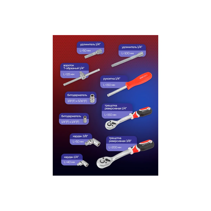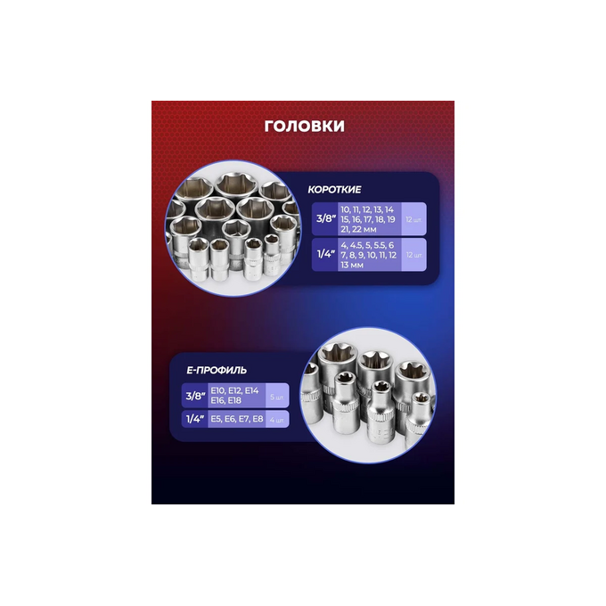 - Разнообразие головок: Набор включает свечные, Е-профиль, короткие и глубокие головки, что обеспечивает гибкость при работе с различными типами крепежа.