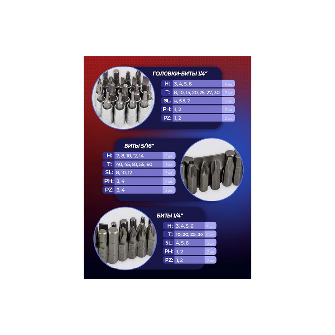 - Биты 5/16": H 7, 8, 10, 12, 14; T: 40, 45, 50, 55, 60; SL: 8,10,12; PH: 3,4; PZ: 3, 4