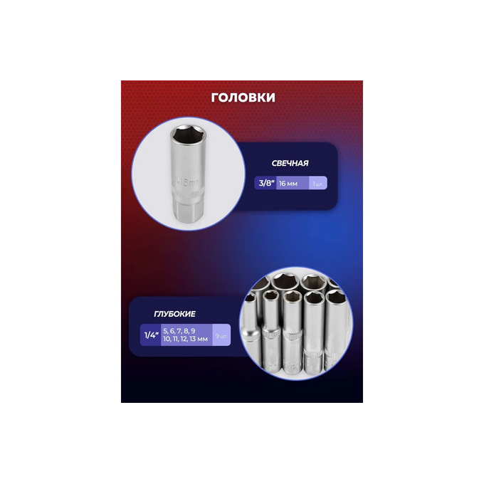 - Головки: 10, 11, 12, 13, 14, 15, 16, 17, 18, 19, 21, 22 мм