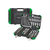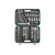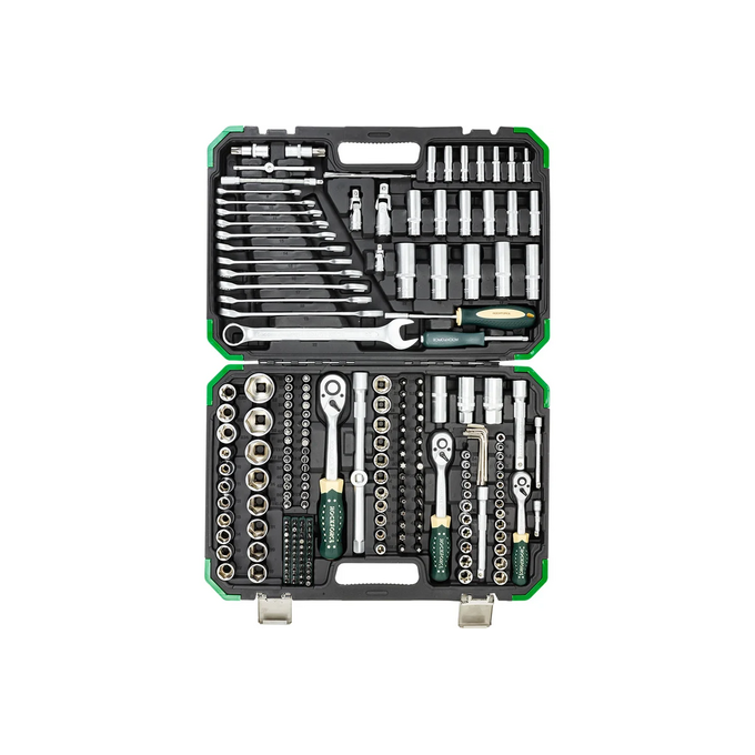 Типы инструментов: Набор включает разнообразные головки (6-гранные, 12-гранные, Е-профиль, короткие и глубокие), биты, трещотки, рукоятки, удлинители, карданные шарниры, свечные головки, комбинированные ключи, Г-образные ключи, отвертки-удлинители, переходники и многое другое.