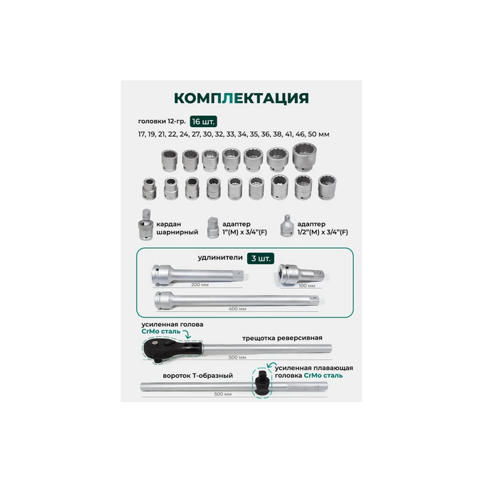 - Головки 17, 19, 21, 22, 24, 27, 30, 32, 33, 34, 35, 36, 36, 41, 46, 50