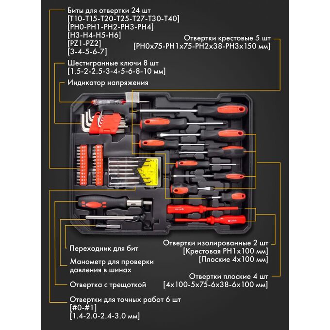 отвертка-вороток, для точных работ (6 шт.), отвертка под биты, шлицевая (SL) (4 шт.), крестовая (PH) (5 шт.), диэлектрическая (2 шт.), индикаторная