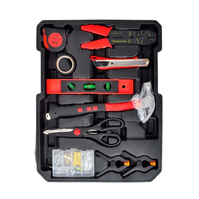 рулетка, изолента, уровень, манометр, чемодан
