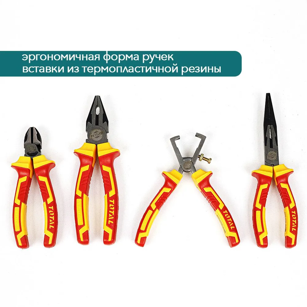 Инструменты в комплекте: Бокорезы, Длинногубцы, Клещи для снятия изоляции, Отвертки, Плоскогубцы