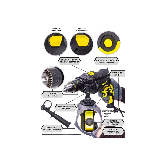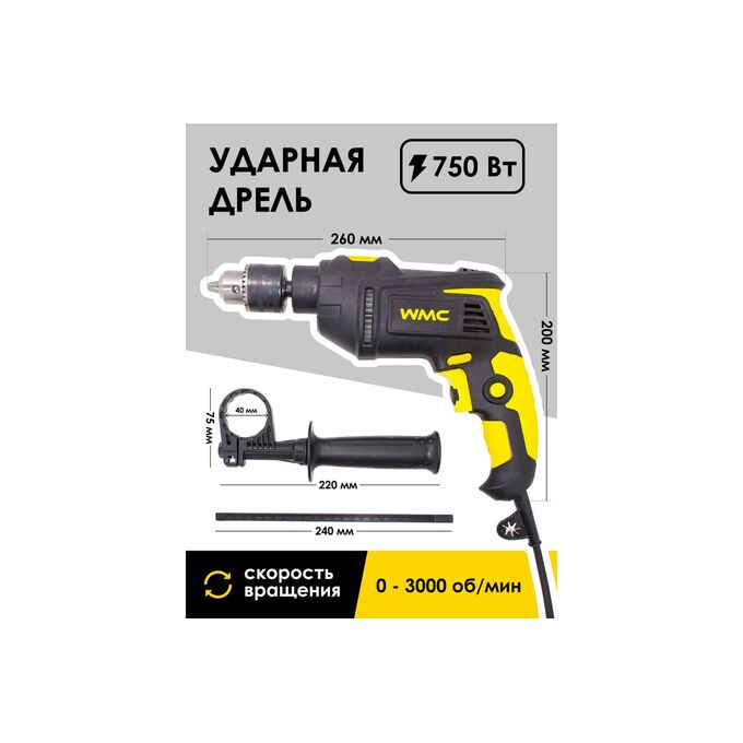 - Ударная дрель 750 Вт 230-240 Вт, скорость холостого хода: 0-3000 об/мин, размер патрона: 13 мм, длина кабеля: 1,8 м