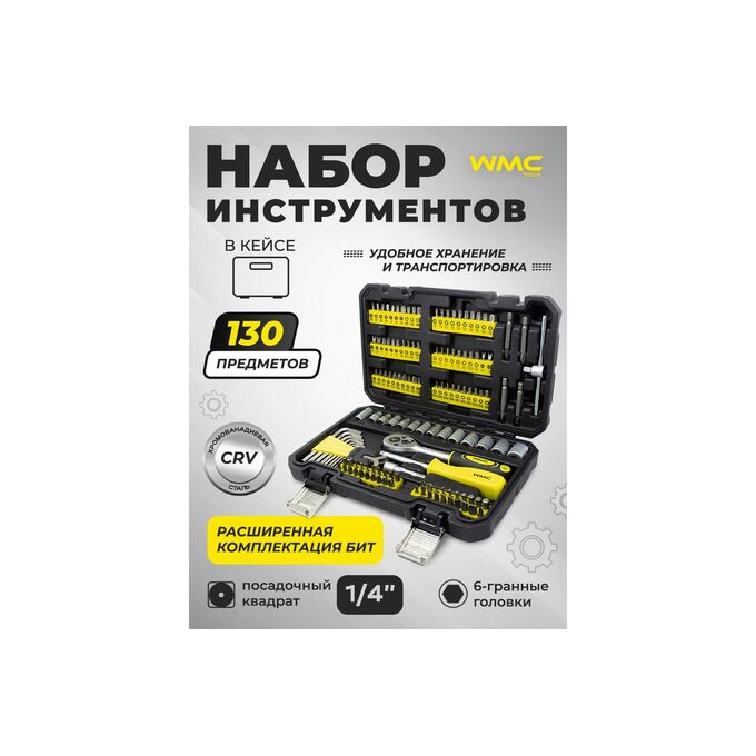 Набор инструментов от бренда WMC TOOLS, состоящий из 130 предметов, упакованных в прочный пластиковый кейс. Этот универсальный комплект инструментов идеально подходит для использования как в быту, так и в профессиональных целях.
