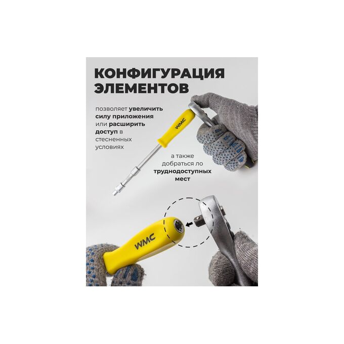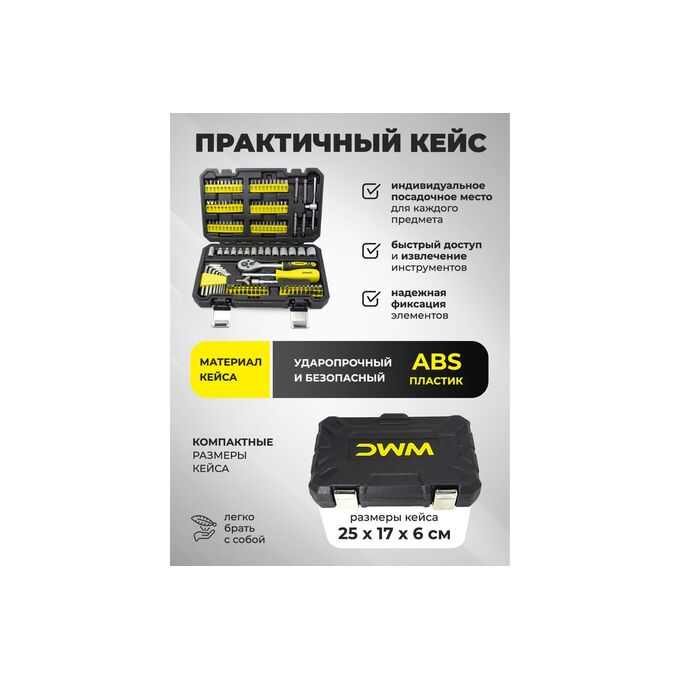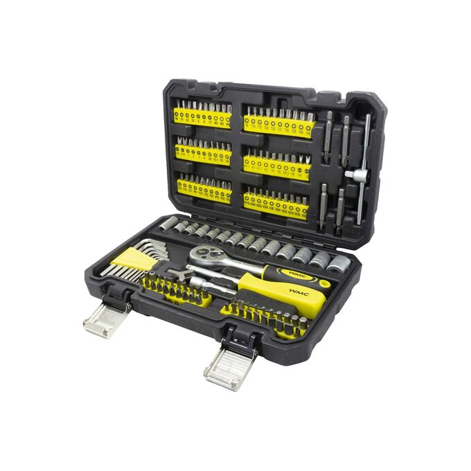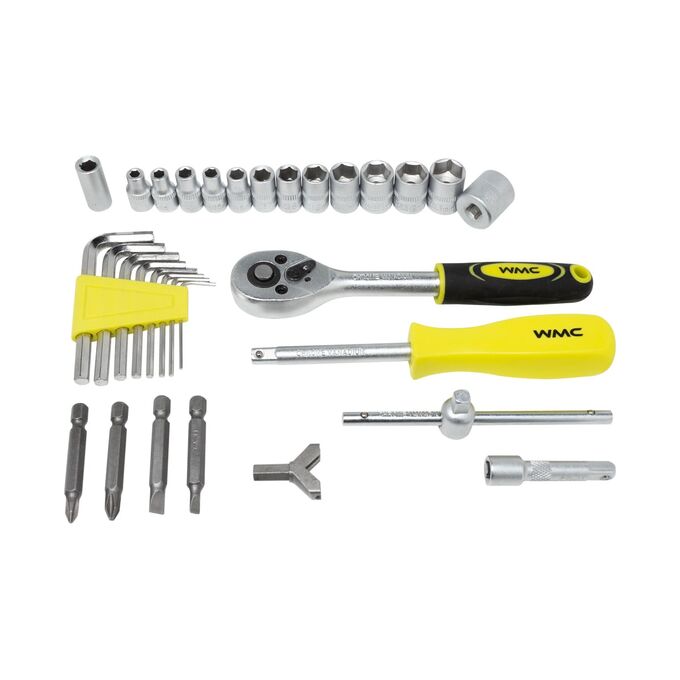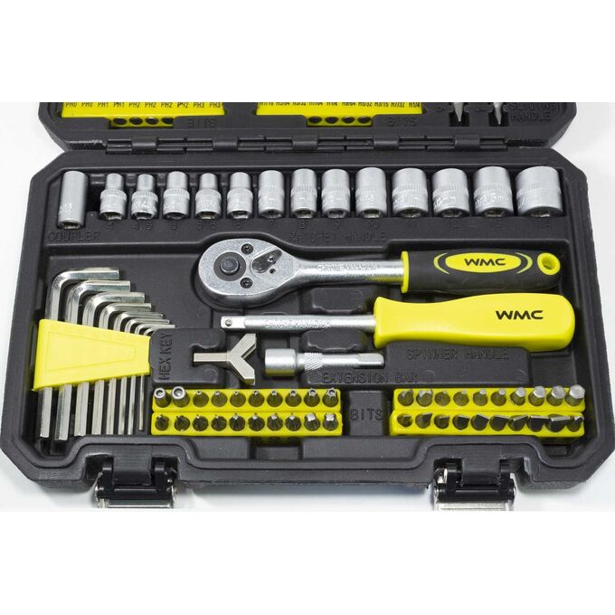 Универсальность и надежность. Набор инструментов WMC Tools обеспечивает все необходимые инструменты для быстрого устранения неисправностей в автомобиле, даче или дома. В него входят торцевые головки, битодержатель, вороток T-образный, трещотка реверсивная, удлинитель, Y-бита для крюков, рукоятка, ключи Г-образные HEX, а также широкий набор битов различных размеров.